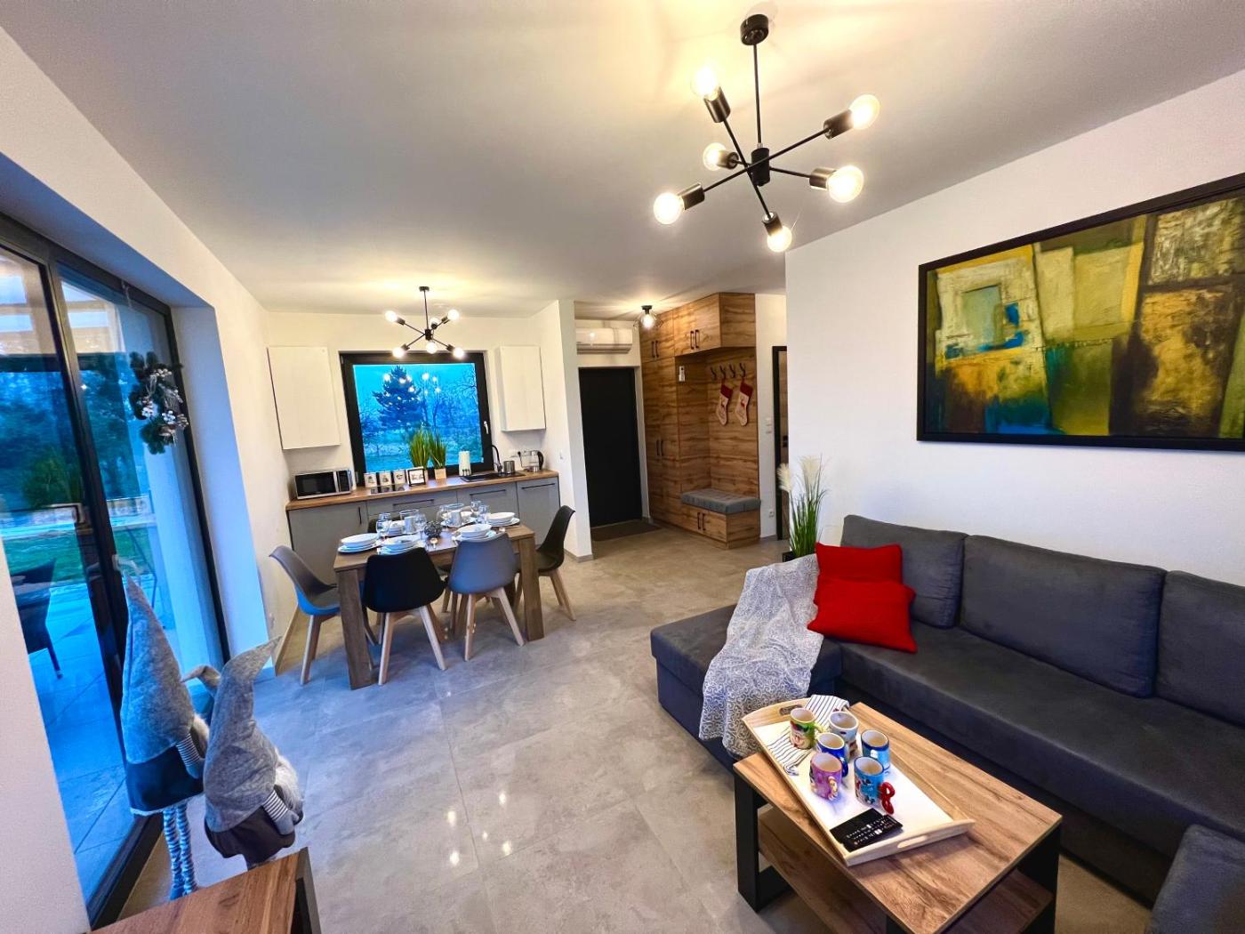 Dom wakacyjny. This holiday homes special features are the private pool and the hot tub. Boasting a private entrance, this air-conditioned holiday home comes with 1 living room, 1 separate bedroom and 1 bathroom with a shower and a hairdryer. Guests will find a stovetop, a refrigerator, a dishwasher and kitchenware in the well-fitted kitchen. The holiday home also includes a barbecue. Featuring a terrace with garden views, this holiday home also features a seating area and a flat-screen TV with streaming services. The unit has 4 beds. Dom wakacyjny - 6 osobowy. Powierzchnia pokoju ok.: 50 mkw.